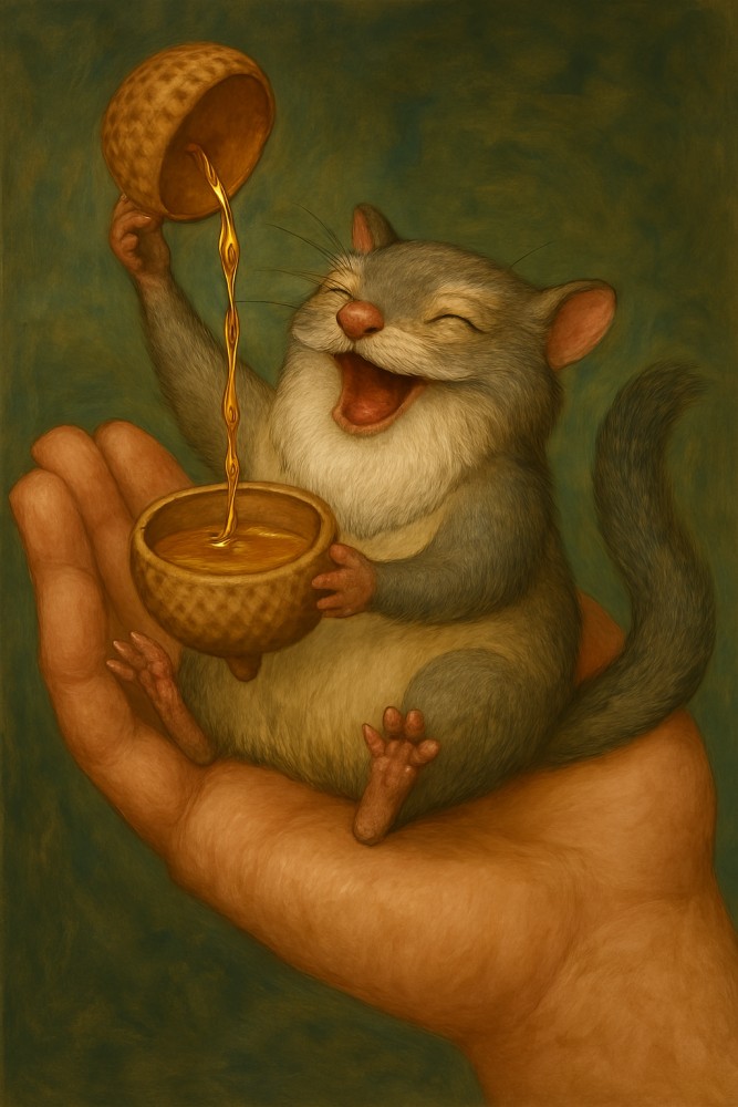 スガルの手元に飛び移り、小さな身体で顔面近くまで登ってきた。どんぐりの実のカラから帽子の杯に酒をそそいでチビチビやりながらだから、長くなりそうだ。
